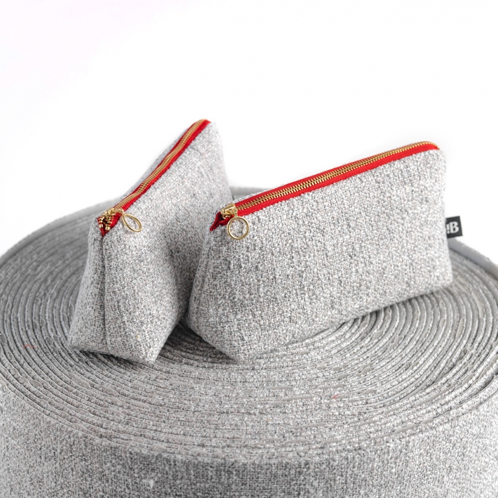 Praktisk og fin fôret clutch i grå velur med glidelås i en forfriskende rødoransje farge. Produsert av avkapp fra norske Wonderland Beds. Tekstilet har en coating på baksiden som gjør mappen stødig og gir den et eksklusivt preg.